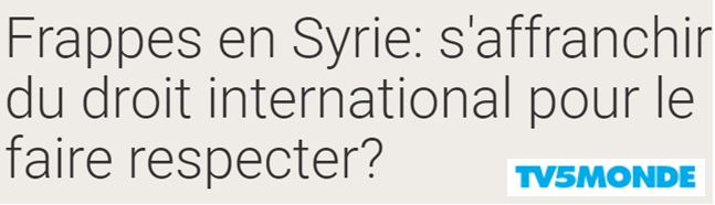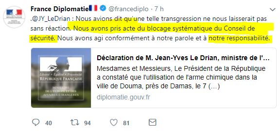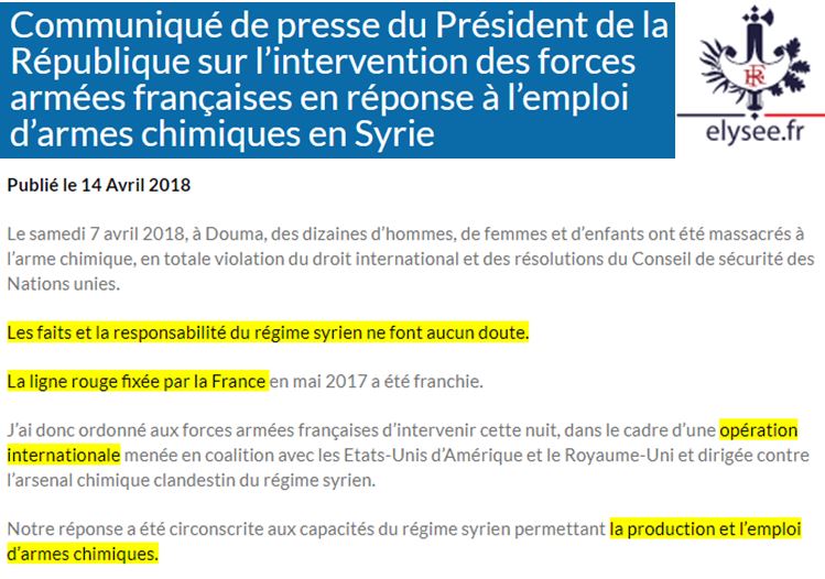 Samedi 14 avril, la France a donc de nouveau choisi de piétiner le Droit international, déshonorant son statut de Membre Permanent du Conseil de Sécurité de l'ONU, et en affichant son mépris pour ce droit, gardien de la Paix et de la Sécurité entre les nations.