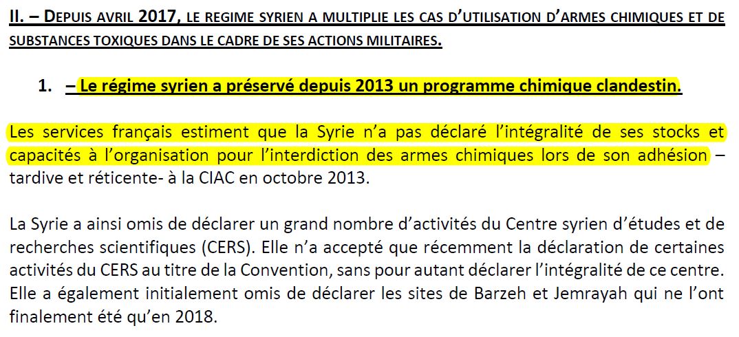 La France accuse la Syrie de préserver un programme chimique clandestin.Ce point est vraiment très important. Mais nous le développeront dans la partie suivante.