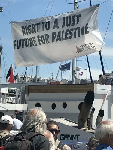 L'un des bateaux, le Al-Awda, au nom symbolique, le Retour a fait escale à la Rochelle, du 7 au 11 juin. Amarré au quai des chalutiers, il a été accueilli par les militant-e-s de la solidarité et la population rochelaise avant de reprendre la mer vers le Nord de l'Espagne où il retrouvera le Freedom qui aura fait escale dans le sud de l'Angleterre.