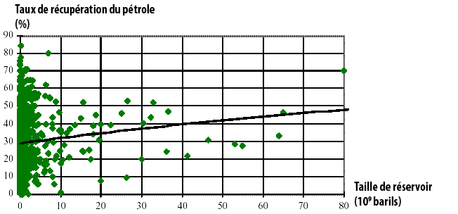La régression linéaire effectuée indique que ce taux de récupération augmente avec la taille du champ, ce qui suggère que le taux de récupération des découvertes futures (qui concernent des champs de plus en plus petits) sera globalement inférieur au taux de récupération pour les champs plus anciens.