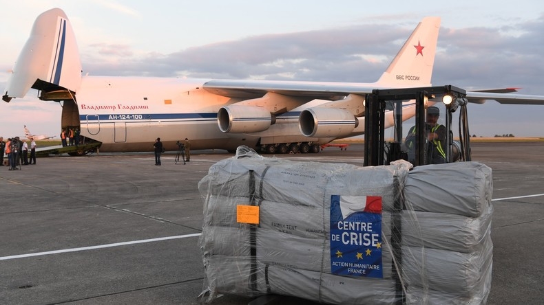 Un gros porteur Antonov 124 de l'armée russe, chargé de 50 tonnes de matériel médical et de biens de première nécessité fournis par la France, a décollé vers 3h du matin, dans la nuit du 20 au 21 juillet, de l'aéroport de Châteauroux (Indre) vers la base russe de Hmeimim, dans l'ouest de la Syrie, a précisé le directeur de l'aéroport, Mark Bottemine, à l'AFP.