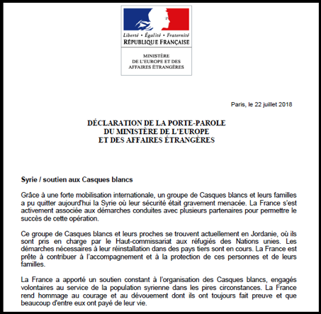 La France annonce qu'elle rend hommage à une organisation terroriste dont le monde a entendu parler pour la première fois, après qu'elle eut massacré les volontaires de la défense civile à Alep, comme l'a prouvé la chercheuse jordanienne, Mme Hayat al-Hweik, sur Al-Mayadeen TV le 23 juillet. Depuis, l'organisation a prétendument endossé une fonction « de secouriste le jour et de terroriste la nuit » comme le disent les gens d'Alep et son épopée prétendument héroïque a fait le tour du monde...