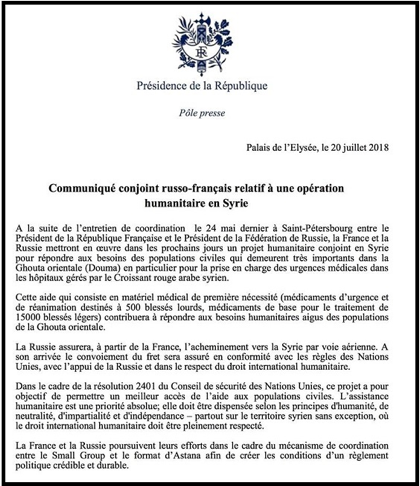 Le communiqué conjoint russo-français relatif à une opération humanitaire en Syrie publié par le Palais de l'Élysée le 20 juillet courant.