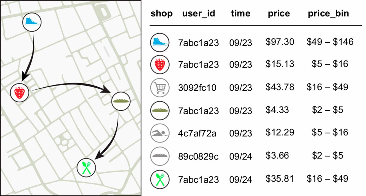 For example, let's say that we are searching for Scott in a simply anonymized credit card data set ( Fig. 1). We know two points about Scott: he went to the bakery on 23 September and to the restaurant on 24 September. Searching through the data set reveals that there is one and only one person in the entire data set who went to these two places on these two days. |S(Ip)| is thus equal to 1, Scott is reidentified, and we now know all of his other transactions, such as the fact that he went shopping for shoes and groceries on 23 September, and how much he spent.