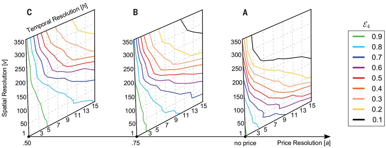 Fig. 3Unicity (ε4) when we lower the resolution of the data set on any or all of the three dimensions; with four spatiotemporal tuples [(A), no price] and with four spatiotemporal-price triples [(B), a = 0.75; (C), a = 0.50].