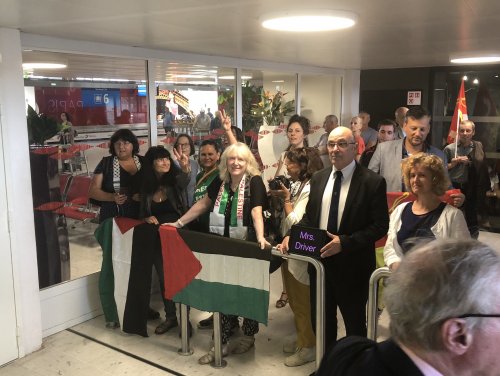 Le Français Pascal Maurieras (avec l'écharpe palestinienne) et le Canadien John Turnbull avec le T.Shirt de la Flotille de Gaza), qui naviguaient sur le Freedom, attaqué le 3 août dernier par des commandos israéliens dans les eaux internationales, ont été accueillis ce mercredi matin à Roissy dans une ambiance chaleureuse.