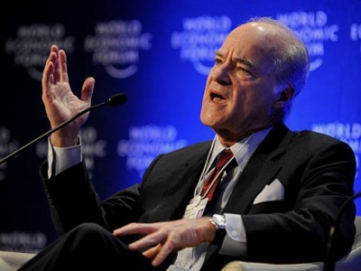 Henry Kravis au Forum de Davos. Proche de John McCain, le fondateur de KKR est membre du Council of Foreign Relations et du Groupe de Bilderberg (dont sa femme est administratrice). Il emploie le général David Petraeus (ancien directeur de la CIA) avec qui il a organisé les transferts de fonds et d'armes à Daesh. Ami de longue date d'Emmanuel Macron, il a secrètement financé sa campagne électorale.