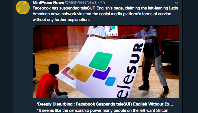 medium.comTeleSUR English, the English version of a prominent left-leaning Latin American publication, has had its Facebook page deleted without explanation. This is the second time that Facebook has done this, and as of this writing, more than 24 hours after it was initially reported, the page is still gone.