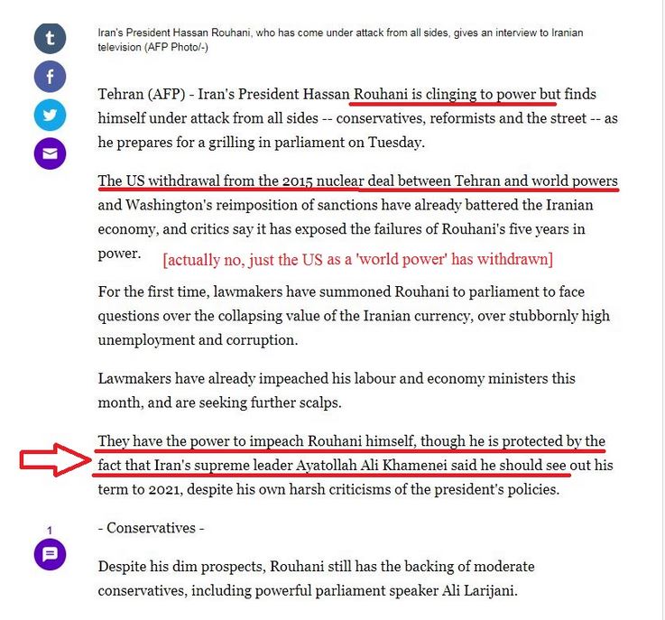 Dans la capture d’écran ci-dessous de la campagne de désinformation de l’AFP – Etat Profond américain, on trouve des notes avec un sous-titre et un texte rouge pour signaler les formulations ridicules, les distorsions flagrantes et les contradictions de la logique interne. Ce qu’ils ne parviennent pas à expliquer, c’est que Rouhani soit un » conservateur favorable aux réformes « . Sa popularité et sa réélection en mai dernier, avec un taux de participation d’environ 70 %, sont fondées sur la recherche d’une voie médiane entre le conservatisme économique et révolutionnaire iranien » anti-occidental » et le » réformisme et pragmatisme » favorable aux occidentaux « .