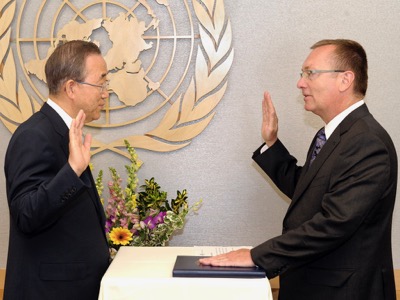 Le 2 juillet 2012, l'ancien assistant d'Hillary Clinton, Jeffrey Feltman devient le numéro 2 des Nations Unies. Il prête serment devant le secrétaire général, le très corrompu Ban Ki-moon, sur la Charte de l'Organisation