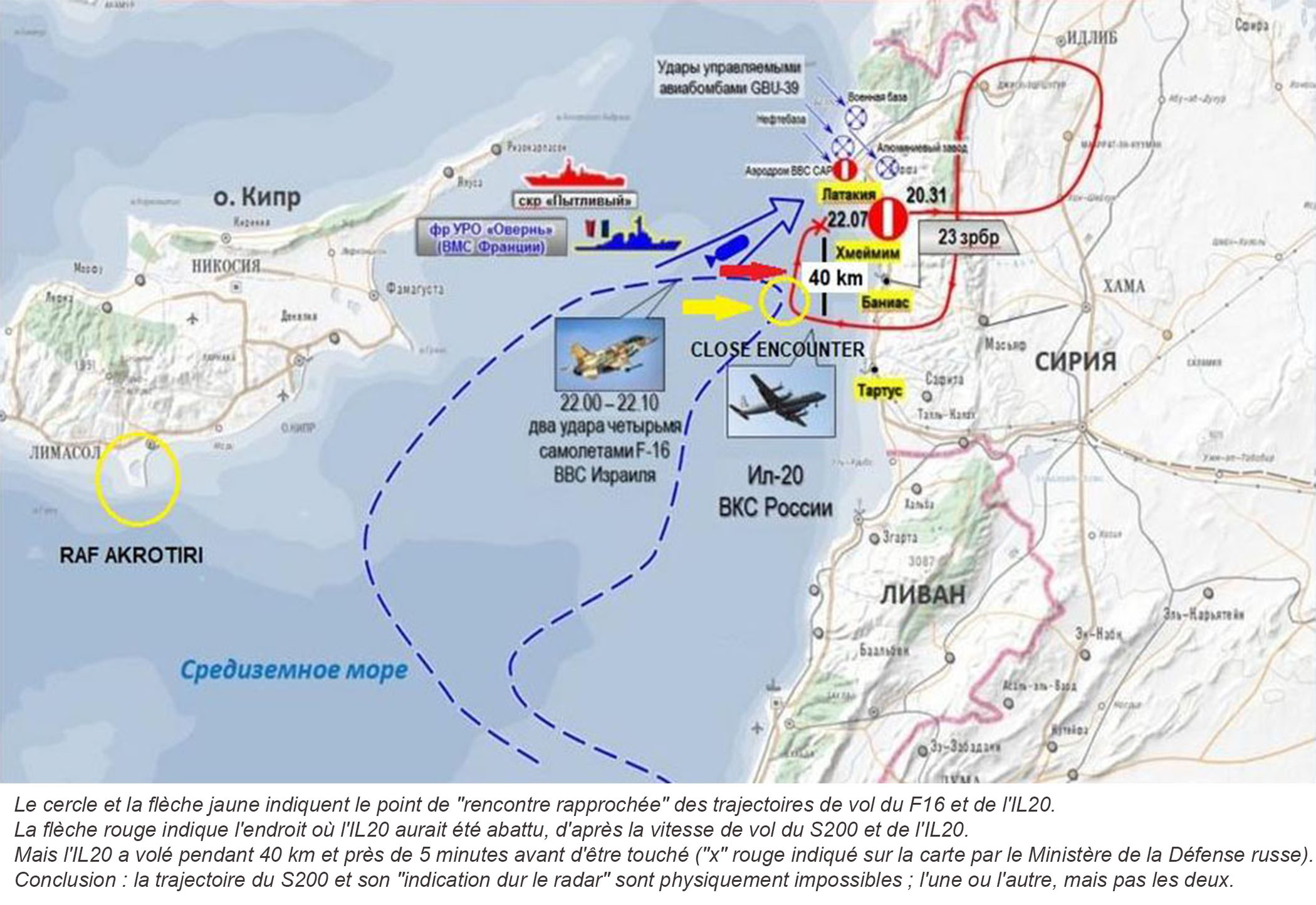 La carte du MoD montre clairement que l’Iliouchine a volé vers le nord sur 40 km après cette « rencontre rapprochée » avec les F16, puis a fait un autre virage à droite de 90 degrés pour se diriger vers la côte syrienne lors de sa descente finale vers Hmeimim.