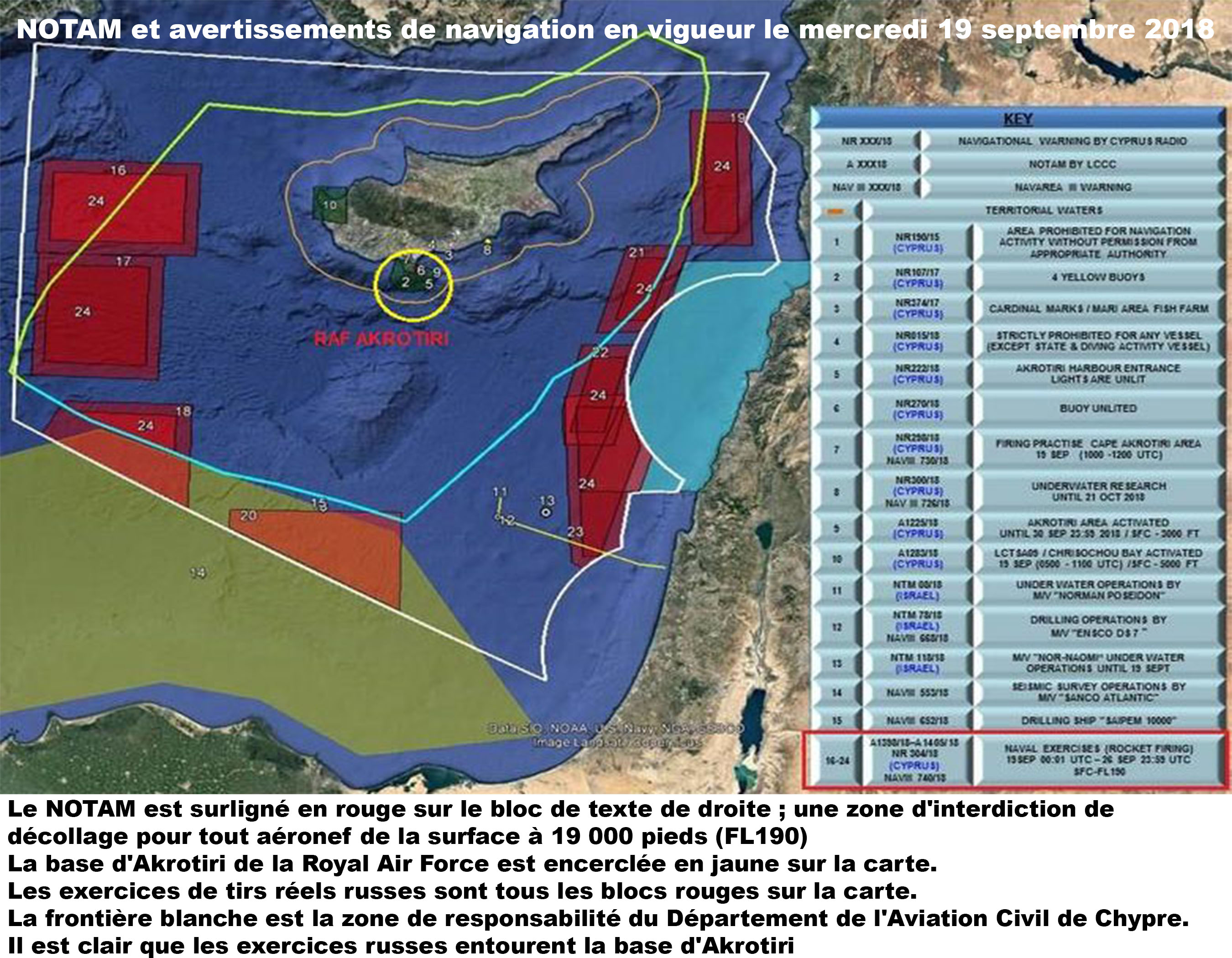 Maintenant, examinons un autre indice, celui qui arrive 24 heures seulement après l’abattage de l’Iliouchine… à savoir les exercices navals de tir réel russes dans la zone exacte de la Méditerranée où toutes les actions ont eu lieu… voici un aperçu du NOTAM publié par la Cyprus Civil Aviation Authority.