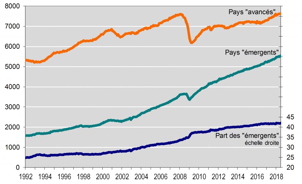 Cette nouvelle forme de mondialisation a servi d'échappatoire à la crise du début des années 1980, en ouvrant un réservoir de main-d'œuvre à bas salaires, encore accru après l'effondrement du « socialisme réel ». Mais elle a conduit à un véritable basculement de l'économie mondiale, comme en fait foi la répartition de la production manufacturière mondiale (hors énergie) : elle a augmenté de 62 % entre 2000 et 2018, mais la quasi-intégralité de cette progression a été réalisée par les pays dits émergents où elle a bien plus que doublé (+152 %) alors qu'elle n'a que faiblement progressé dans les pays avancés (+16 %).Les pays émergents réalisent aujourd'hui, 42 % de la production manufacturière mondiale, contre 27 % en 2000 (graphique 2) (3). Dans certains pays, comme la Chine et la Corée du Sud, cette industrialisation est de moins en moins cantonnée aux industries d'assemblage (textile ou électronique) et marque une « remontée des filières » vers des produits de haute technologie, voire des biens de production.