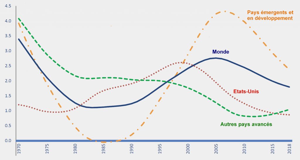 Le dynamisme du capitalisme repose en dernière instance sur sa capacité à dégager des gains de productivité, autrement dit à faire croître le volume de marchandises produites en une heure de travail. Depuis les récessions généralisées de 1974-75 et 1980-82, les gains de productivité ont tendanciellement ralenti. On est passé de ce que certains ont qualifié d'« Âge d'or » (pour souligner le caractère exceptionnel de cette période) au capitalisme néo-libéral, aujourd'hui menacé par une « stagnation séculaire ». Durant cette période, le capitalisme a réussi cette prouesse : rétablir la profitabilité en dépit du ralentissement des gains de productivité illustré par le graphique 1 ci-dessous (1).
