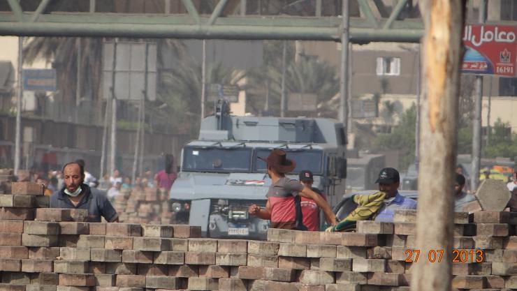 En photo : Véhicule blindé Sherpa LSW photographié derrière des barricades de briques érigées au niveau de l'intersection proche de la faculté de pédagogie de l'université al Azhar, Le Caire, 27 juillet 2013. Le Sherpa LSW a une plaque d'immatriculation de la police.