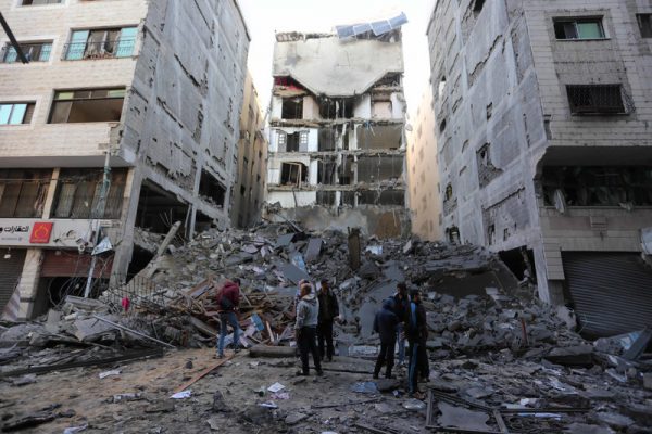 Palestinians look at the rubble of a building after an Israeli airstrike in Gaza City on 13 November. (Ashraf Amra APA images)