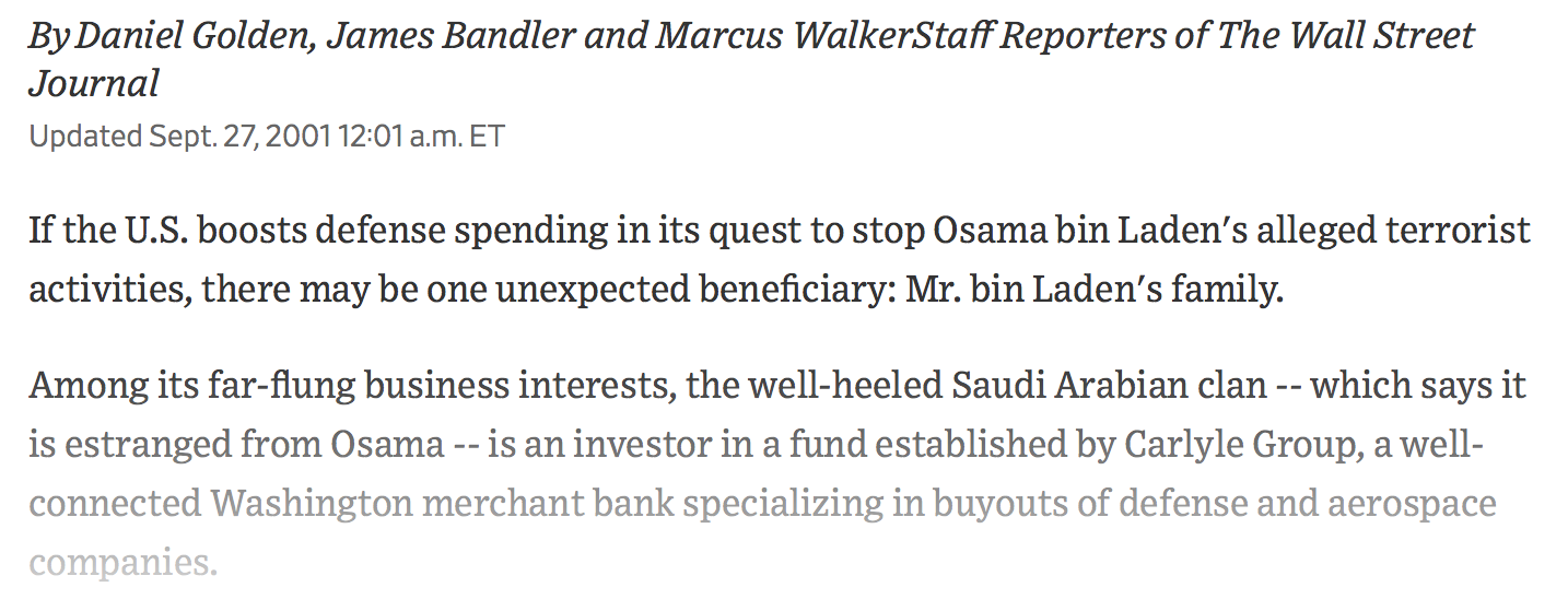 Cela n'a pas aidé que le World Trade Center ait brûlé le 11 septembre 2001. La nouvelle a interrompu une réunion d'affaires du groupe Carlyle à l'hôtel Ritz-Carlton, à laquelle participait un frère d'Oussama ben Laden. L'ex-président Bush, qui est un investisseur, était avec lui à la conférence la veille. (WaPo, 16 mars 2003)