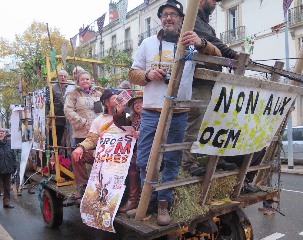 Il fait encore nuit sur la place Wilson à Dijon, où se tenait en 2016 l'assemblée de Nuit debout. Une bonne centaine de personnes bravent le crachin automnal pour accompagner le cortège des « faucheurs d'OGM » jusqu'au tribunal de grande instance, où ils doivent être jugés pour avoir « neutralisé » des parcelles de colza mutagène. Une petite dizaine de prévenus sont juchés sur une charrette, tirée par deux chevaux francs-comtois. Certains sont enfermés à l'intérieur d'une cage, prison symbolique d'une action de désobéissance civile. Ce jeudi 15 novembre, 38 personnes sont inculpées de dégradation de biens d'autrui par Dijon Céréales, la coopérative agricole responsable de ces plants de colza expérimental qui ont été fauchés. Pour les militants, il s'agit d'OGM cachés. Mais pour la coopérative, « ces faucheurs saccagent le travail expérimental mené par des techniciens dont l'objectif est de faire cohabiter population, environnement et qualité des produits agricoles ». Elle requiert un dédommagement d'un euro symbolique par faucheur et 15.000 pour les frais d'avocats.