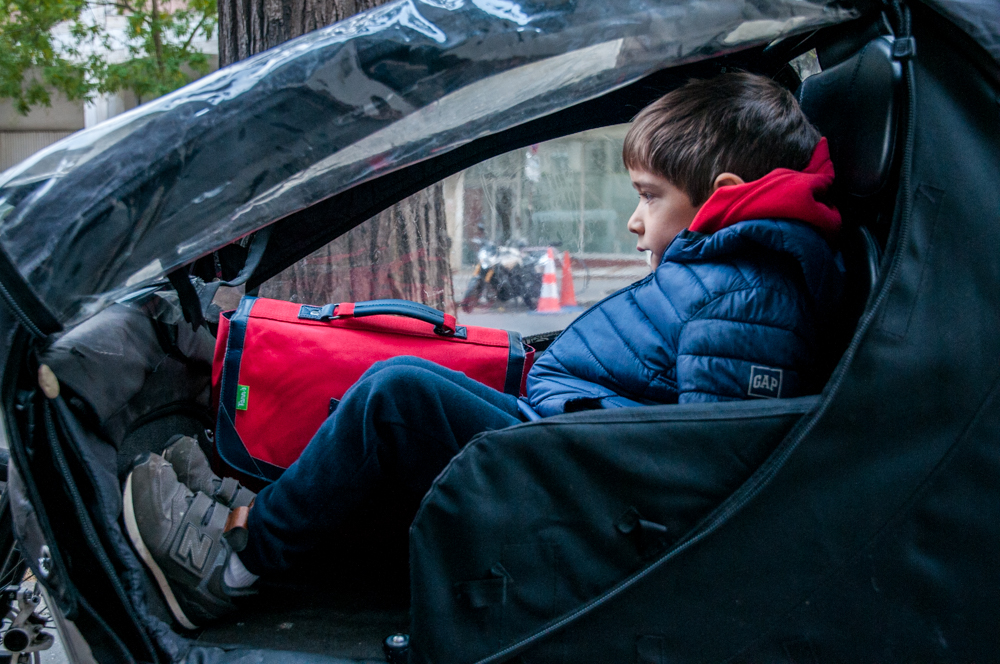 Un autre inconvénient souvent mis en avant par les curieux du vélo cargo qui n'ont pas encore pris le guidon, ce sont les intempéries. Pour Diane et Jean-Baptiste, il ne s'agit pas du tout d'un inconvénient, cela demande simplement de s'équiper un peu. Il y a d'ailleurs un proverbe qui revient souvent dans la bouche des cyclistes : « Il n'y a pas de mauvaise condition météorologique, il n'y a que de mauvais équipements. » Pour les enfants, il y a la capote hivernale, sous laquelle Raphaël se sent comme un poisson dans l'eau.