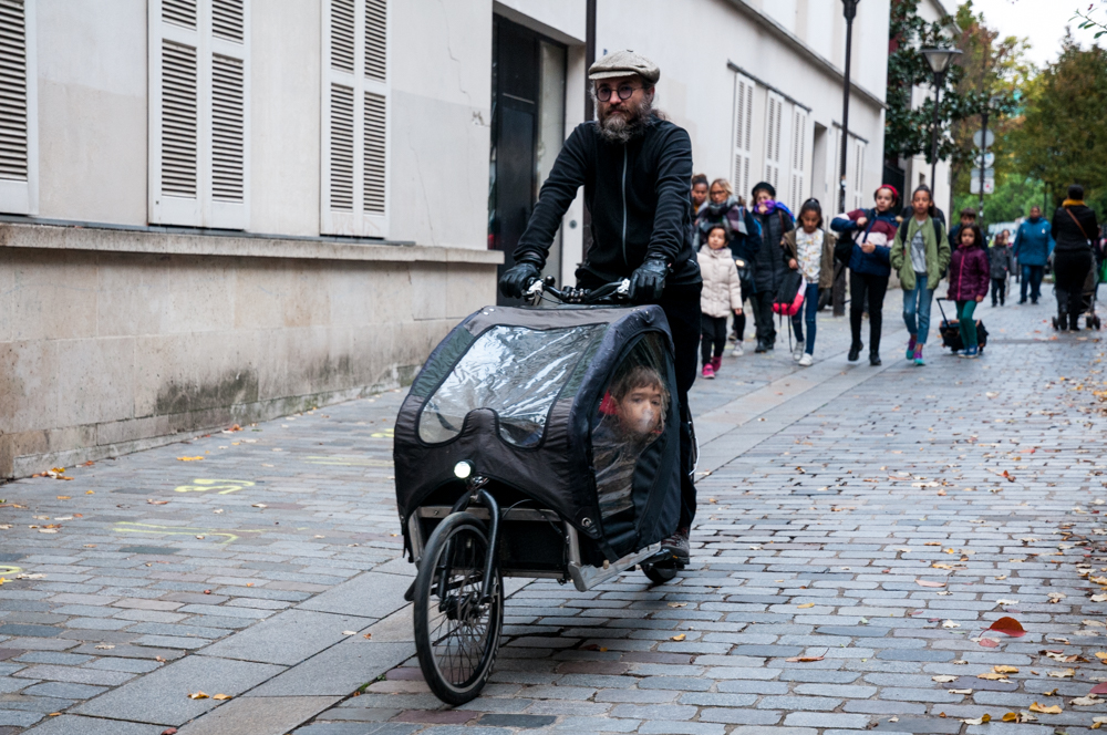 « À l'école, les autres parents me questionnent de plus en plus et semblent se rendre compte que c'est plus convivial et que circuler à vélo cargo avec ses enfants, ça rend plus heureux ! J'ai l'impression qu'ils commencent à se dire « et pourquoi pas nous ? » Par exemple, tous les mardis, après l'école, on est une dizaine de parents à amener nos enfants à la piscine. Je récupère les miens au portail de l'école, pendant le trajet, ils s'aèrent un peu tout en prenant leur goûter et en me racontant leur journée. Tous les trois, on arrive tout sourire à la piscine et on a même un petit moment ensemble. Les autres parents, qui ont amené leurs enfants en voiture, arrivent souvent à la dernière minute et stressés parce qu'ils ont galéré pour se garer. »