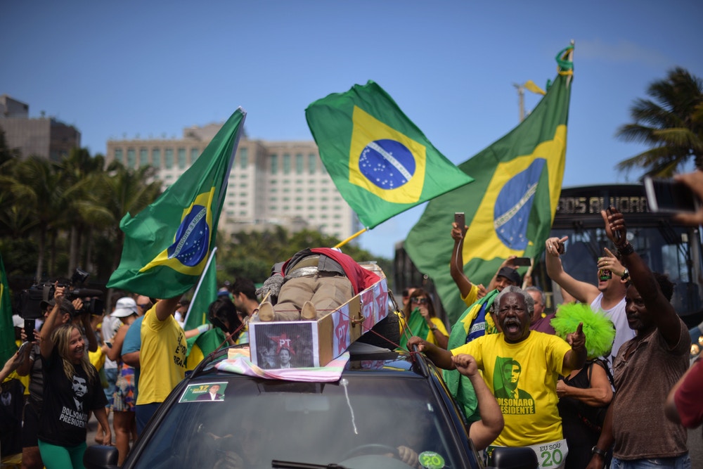 Des partisans de Bolsonaro défilent avec un simulacre de cercueil représentant le Parti des travailleurs, à Rio de Janeiro, Brésil, lors du second tour des élections présidentielles, le 28 octobre 2018. Photo : Carl de Souza/AFP/Getty Images