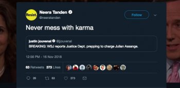 Depuis que les soupçons ont été confirmés que l'administration Trump travaille effectivement à poursuivre et emprisonner le fondateur de WikiLeaks, Julian Assange, pour avoir publié des documents authentiques, la soi-disant "Résistance" se démène pour expliquer exactement pourquoi elle soutient avec autant d'enthousiasme cet opération. Et quand je dis « se démène », je suis très, très généreuse. Quand on a appris qu'une erreur de copier-coller d'un document judiciaire avait par inadvertance révélé le fait que l'administration Trump poursuivait un programme qui, de l'avis de divers [ expertshttps://theintercept.com/2018/11/16/as-the-obama-doj-concluded-...] politiques, aurait des effets dévastateurs sur la liberté de la presse, le supporter de #Resistance et membre d'un think tank de Washington, Neera Tanden, a répondu par un tweet, "Never mess with karma" [Ne jouez jamais avec le karma]. Au moment d'écrire ces lignes, si vous faites une recherche sur Twitter des mots "Assange" et "karma" ensemble, vous trouverez d'innombrables loyalistes du Parti démocrate utilisant ce concept pour justifier leur soutien à une attaque de l'administration Trump contre la presse infiniment plus dangereuse que les saillies du Président contre Jim Acosta.