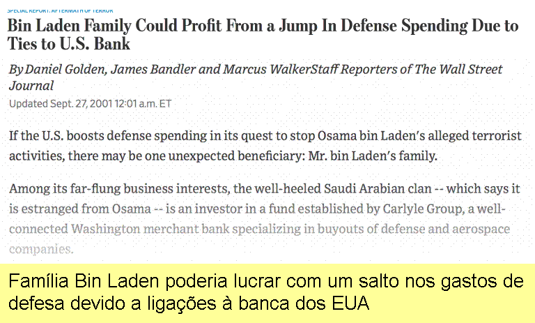 Aqui está um conceito tipo « acredite ou não »: se os EUA aumentassem os gastos de defesa para perseguir Osama bin Laden (Inimigo Número Um), a família Bin Laden beneficiaria, por assim dizer, porque (em setembro de 2001) eles eram parceiros do Carlyle Group, uma das maiores empresas de gestão de ativos do mundo: