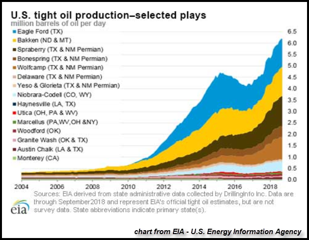 De plus, l'industrie du schiste pourrait devoir vendre un quart de sa production pétrolière (1,5 million de barils par jour) uniquement pour assurer le service de sa dette d'ici la fin de 2019. Selon l'EIA, l'Agence d'information sur l'énergie des États-Unis, la production totale de pétrole de schiste (pétrole de réservoirs étanches) est maintenant de 6,2 millions de barils par jour (mbj) :