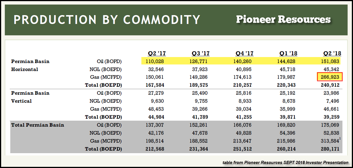 Vous remarquerez que la production de Pioneer dans le schiste a augmenté de façon significative au troisième et quatrième trimestre de 2017 par rapport au premier et au deuxième trimestre de 2018. Par ailleurs, la production de gaz de schiste de Pioneer a bondi de près de 50% au 2ème trimestre 2018 (mis en évidence par un encadré rouge) alors que la production de pétrole n'a augmenté que de 5%. Il s'agit là d'un important indicateur pour la production de gaz naturel, qui a bondi d'autant au cours d'un seul trimestre.