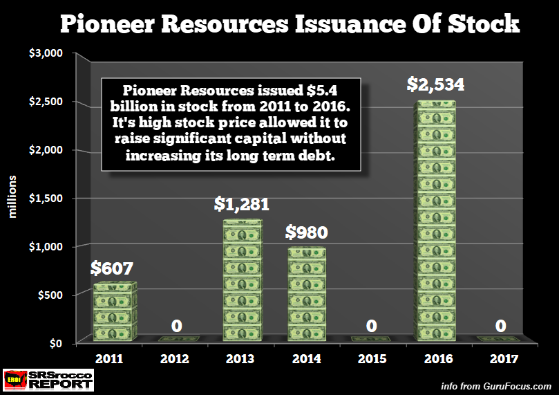 Pioneer Resources est un parfait exemple de cette pratique... le premier producteur de schiste du puissant bassin Permien. Alors que la plupart des entreprises ont augmenté leur endettement pour financer leurs opérations, Pioneer a décidé de profiter du cours élevé de ses actions en levant des fonds par dilution d'actions. Le nombre d'actions en circulation de Pioneer est passé de 115 millions en 2010 à 170 millions en 2017. De 2011 à 2016, Pioneer a émis pour 5,4 milliards de dollars de nouvelles actions :