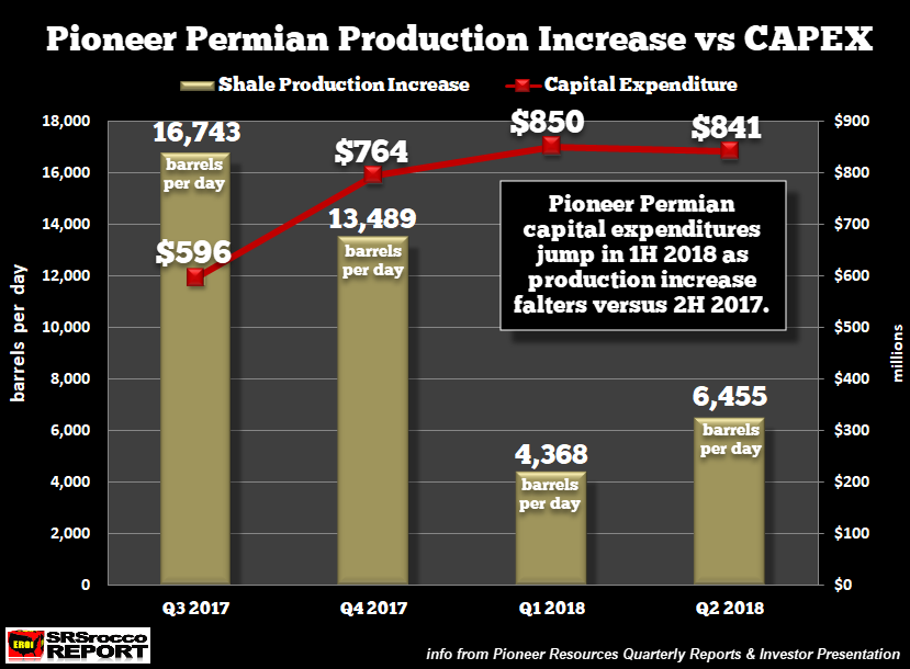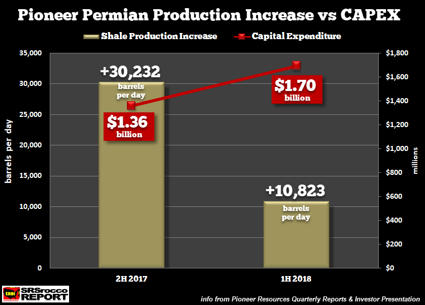 Eh bien, j'espère que c'est vrai parce que les résultats de production du premier semestre 2018 de Pioneer dans le Permien ont été assez décevants par rapport à la période précédente. Si nous comparons l'augmentation de la production de pétrole de schiste de Pioneer dans le Permien par rapport à ses dépenses en capital, nous constatons que quelque chose ne tourne pas rond.