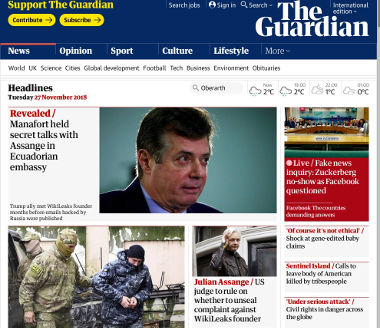Le 27 novembre, le Guardian s'apprêtait à publier un article affirmant que Paul Manafort, ancien directeur de campagne de Trump, avait rencontré Julian Assange, éditeur de Wikileaks, à l'ambassade d'Équateur à Londres, à au moins trois occasions. Environ deux heures avant la parution de l'histoire, il a contacté les avocats de Manafort et d'Assange pour obtenir leurs commentaires.