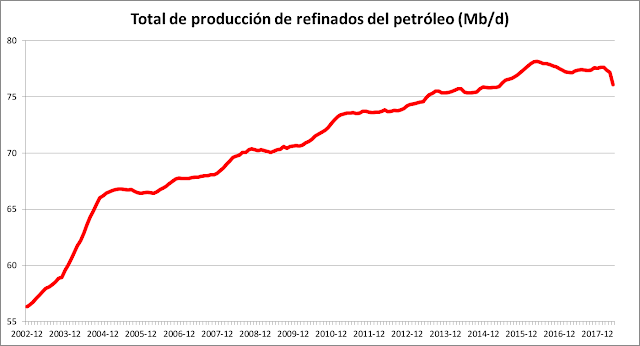 Ce chiffre montre qu'après l'effondrement de 2008-2009, il a été très difficile d'augmenter la production totale de mazout, qui a culminé en 2014 et est restée à ce niveau pendant près d'un an, et qui connaît actuellement une chute spectaculaire (environ 2,5 Mb/j par rapport aux niveaux de 2014).