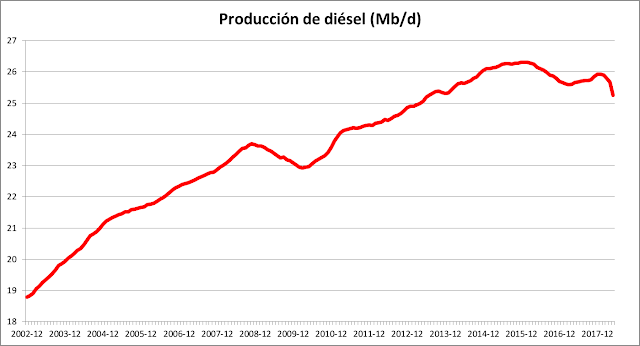 Tous les graphiques que je vais vous montrer sont corrigés des variations saisonnières, c'est-à-dire que les points correspondent à la moyenne des 12 mois précédents. De cette façon, les effets de la variation due à la saison sont évités, le graphique est moins chaotique et les tendances sont mieux perçues. Les graphiques seront toujours exprimés en millions de barils par jour (Mb/j). Tout d'abord, je vous montre le graphique de l'évolution de la production de diesel au cours des dernières années :