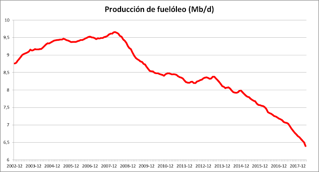 Comme le montre le graphique, depuis 2007 (et donc avant le début officiel de la crise économique), la production de fioul est en baisse et cela semble être une tendance parfaitement consolidée. L'interprétation économiste pure et simple est de considérer qu'il n'y a tout simplement pas de demande pour ces carburants (qui, bien que de la même famille, sont plus lourds que le diesel). Lorsque l'huile est raffinée, elle est soumise à un processus appelé craquage, dans lequel les longues chaînes moléculaires présentes dans l'huile sont brisées (au moyen de la chaleur et d'autres procédés) et les molécules sont ensuite séparées par leurs différentes propriétés de fluidité et densité. Le fait est que si vous avez fait des changements dans les raffineries pour craquer plus de molécules de pétrole et obtenir d'autres produits plus légers (et c'est pourquoi moins de mazout lourd est produit), les molécules qui allaient auparavant vers le mazout lourd vont maintenant vers d'autres produits.