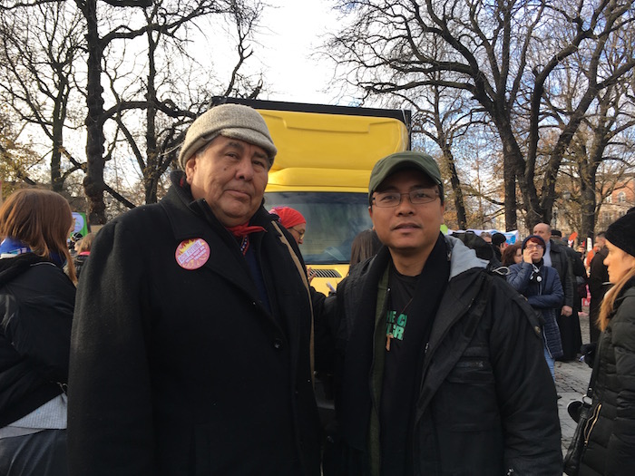 Une fois son intervention terminée, je le prends à part et lui demande pourquoi il est venu jusqu'ici, à Katowice. « Si les négociations échouent ici, c'est comme si on faisait une croix sur l'Accord de Paris, répond-il. Il s'agit d'une crise climatique, politique, mais aussi spirituelle : il faut combattre l'avidité et l'arrogance, qui mènent les gouvernements et les entreprises. » Derrière moi, un homme à la large carrure attend son tour : lui aussi veut parler à l'activiste philippin. Il se présente ; c'est Tom BK Goldtooth, de la tribu amérindienne des Navajos. Sous mes yeux, les deux hommes échangent leurs adresses de courriels : une COP, c'est aussi ça, des liens qui se créent, d'un continent à l'autre, et des luttes qui convergent.
