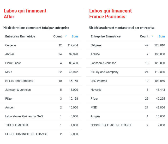 Abbvie est le deuxième laboratoire qui finance le plus France Psoriasis (138 000 euros en six ans), selon l'outil EurosForDocs, qui recense les données de la base Transparence Santé. Idem pour l'Aflar, soutenue par Abbvie à hauteur de 92 920 euros depuis 2012 (l'ensemble de l'industrie pharmaceutique lui a versé 435 689 euros). « S'il y avait un financement public des associations de patients, cela réglerait les problèmes de liens d'intérêts : ce n'est pas le cas, indique Laurent Grange, président de l'Aflar. Soit on ne fait rien, soit on fait avec les laboratoires car ce sont eux qui ont de l'argent, mais on le fait avec éthique, en validant scientifiquement les campagnes, et avec les patients. » Une posture qui suscite la critique : « Quand une association de patients est financée par un laboratoire, elle n'a pas intérêt à demander une baisse du prix du médicament », dénonce quant à elle Elise Van Beneden, avocate de l'association de lutte contre la corruption Anticor [4] (lire notre article « Les associations de patients, des alliés précieux pour l'industrie du médicament et des implants médicaux »).