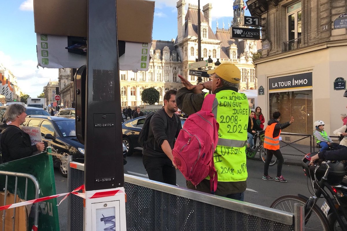 • 14h : Une quarantaine de personnes ont bloqué le McDo rue de Rivoli. Plus personne n'entrait dans le restaurant. Un groupe de musique - saxo et clarinette - jouait, une assemblée générale était en cours. Les activistes ont également bloqué toute circulation entre l'Hôtel de Ville et le Louvre. Les gendarmes se tenaient pour le moment éloignés. Le « Paris sans voiture » d'Anne Hidalgo est devenu réalité.