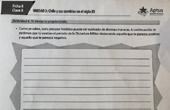 « Qu'y a-t-il de positif dans une dictature ? » : c'est probablement la première question qui est venue à l'esprit de beaucoup de gens lorsqu'ils ont pris connaissance du texte scolaire pour la sixième année de l'école primaire des éditions Aptus qui invite les élèves à réfléchir sur le régime dirigé par Augusto Pinochet, en indiquant les aspects " positifs " et " négatifs " de cette période.
