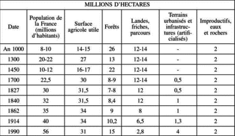Entre 1450 et 1700, la surface agricole utile a pratiquement doublé pour atteindre 30 millions d'hectares et inversement, la superficie des forêts a drastiquement chuté à 9 hectares, signe du pillage qui a été effectué pour les différents besoins.