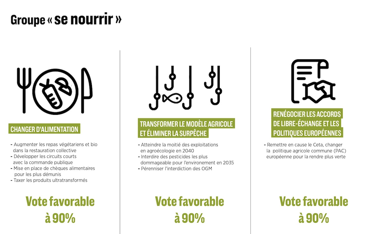 Après neuf mois de travail, les 150 membres ont voté tout au long du week-end leurs propositions. Au-delà de l'objectif initial de réduction des émissions de gaz à effet de serre, les citoyens et citoyennes ont tenu à dessiner « un nouveau modèle de société », un horizon plus sobre et plus écologique pour la France.