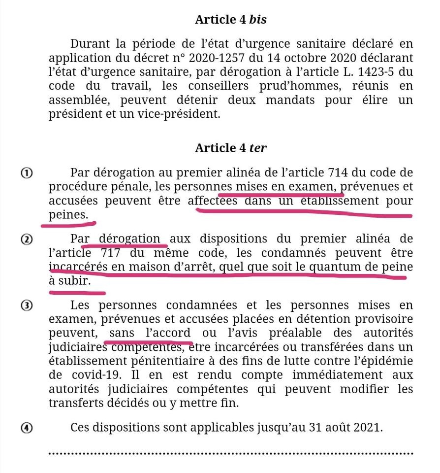 Sans aucun jugement nous pourrons être « incarcéré ou transféré dans un établissement pénitentiaire à des fins de lutte contre l'épidémie de COVID »