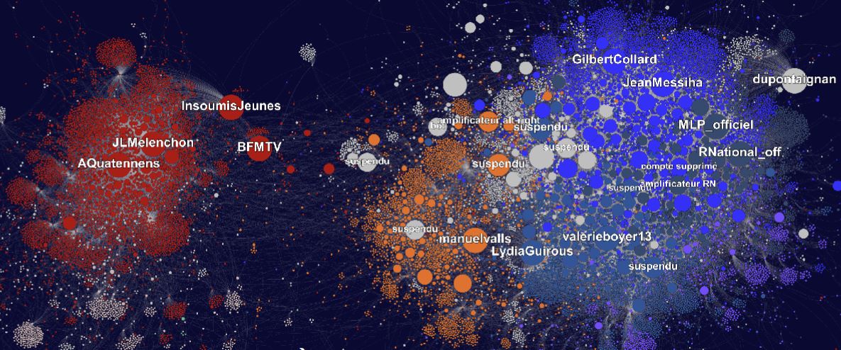 Cartographie des communautés politiques mentionnant « islamo-gauchisme ». Chaque point est un compte Twitter, sa couleur indique son appartenance à un courant politique. Les couleurs et et les positions des points sont déterminés algorithmiquement en fonction des interactions entre comptes (pas d'intervention humaine, voir Gaumont et al. 2018 pour plus de précisions). A droite, les communautés d'extrême-droite et LR utilisant ce terme de manière hostile pour dénigrer ou stigmatiser la communauté LFI (à gauche) qui se défend. La taille des nœuds est fonction du nombre de leurs tweets mentionnant « islamo-gauchisme », mise à part celle des nœuds labellisés par des noms de personnalités, dont la taille a été augmentée pour des questions de visualisation. On remarquera la présence marquée de comptes très impliqués dans ce type d'échanges et suspendus depuis par Twitter. Image : CNRS, David Chavalarias - CC BY-ND 4.0.