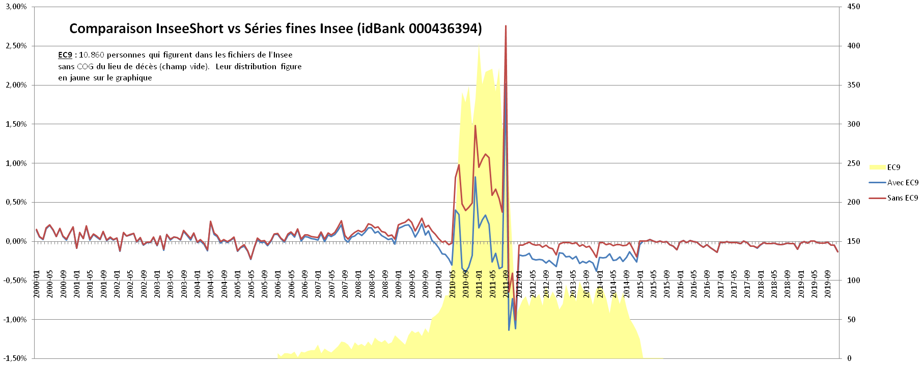 En jaune, la répartition de ces curieux décès sans COG lieu de décès. On voit que la courbe rouge, celle qui filtre les fameuses fiches sans lieu de décès, se rapproche nettement plus de zéro, notamment pour ce qui concerne la période allant de janvier 2012 à décembre 2019.