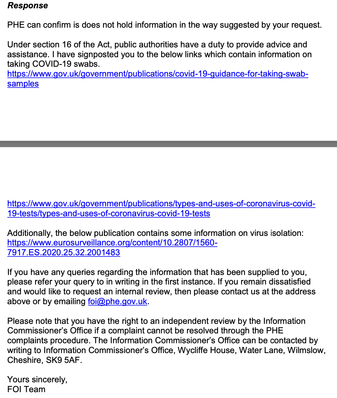« Les 90 établissements de santé / sciences qui ont répondu jusqu'à présent ont fourni et/ou cité, au total, zéro dossier de ce type :Nos demandes [sous la « liberté d'information »] n'ont pas été limitées aux dossiers d'isolement effectués par l'institution respective, ni aux documents rédigés par l'institution respective, mais étaient plutôt ouvertes à tout document décrivant l'isolement/la purification du « virus de la COVID-19 » (alias « SRAS-COV-2) effectué par quiconque, jamais, n'importe où sur la planète. »