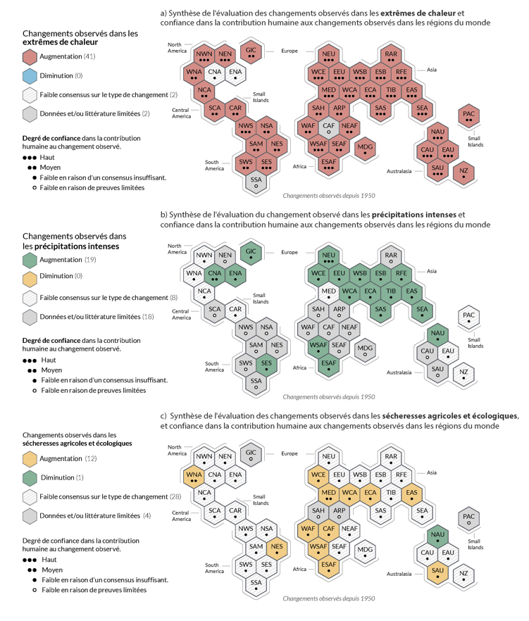 - Le changement climatique d'origine humaine affecte déjà de nombreux phénomènes météorologiques et climatiques extrêmes dans toutes les régions du monde. Les preuves des changements observés dans les phénomènes extrêmes tels que les vagues de chaleur, les fortes précipitations, les sécheresses et les cyclones tropicaux, et, en particulier, leur attribution à l'influence humaine, se sont renforcées depuis le cinquième rapport d'évaluation.