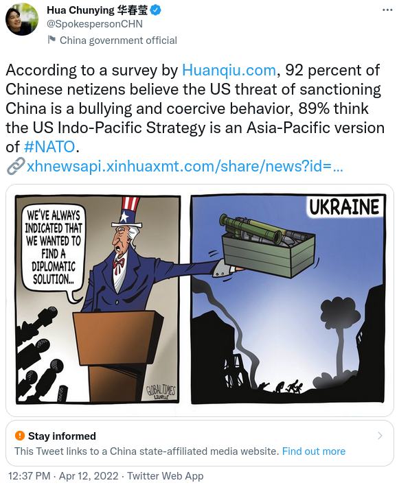 Selon un sondage réalisé par Huanqiu.com 92 % des net-citoyens chinois pensent que la menace américaine de sanctions à l'encontre de la Chine est un comportement d'intimidation et de coercition, 89 % pensent que la stratégie indo-pacifique américaine est une version Asie-Pacifique de #OTAN. - Source