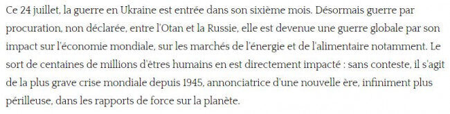 En à peine six mois de guerre (le paragraphe d'intro est de Pierre Lellouche dans Marianne), les rapports de force qui autrefois étaient latents ont émergé, la tectonique géopolitique mondiale a bougé, les grandes nations ont dû choisir un camp (ou une prudente neutralité), de nouvelles alliances ont surgi, le monde se restructure autour du conflit en Ukraine, qui a tout changé.