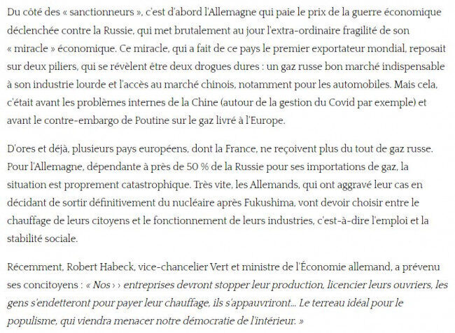 Maintenant, on parle de coupures d'électricité en hiver, de pénuries de bouffe, de récession brutale, pour ne parler que de la France. L'Allemagne, qui a besoin du marché chinois et du gaz russe pour entretenir sa puissance économique de premier exportateur mondial, est au bord du précipice, faisant même dire à des hommes politiques antirusses que le risque est devenu trop grand. Le sacrifice pour l'OTAN, et donc l'oncle Sam, est total pour le couple franco-allemand. La balance bénéfice-risque penche complètement du côté du risque, avec zéro bénéfice à la clé. Français et Allemands sont piégés par le contrat léonin signé (par des dirigeants corrompus) avec l'OTAN, qui les enchaîne à la politique extérieure de l'Amérique, qui elle ne prend aucun risque. Francis Cousin le dit simplement, sur TV Libertés :