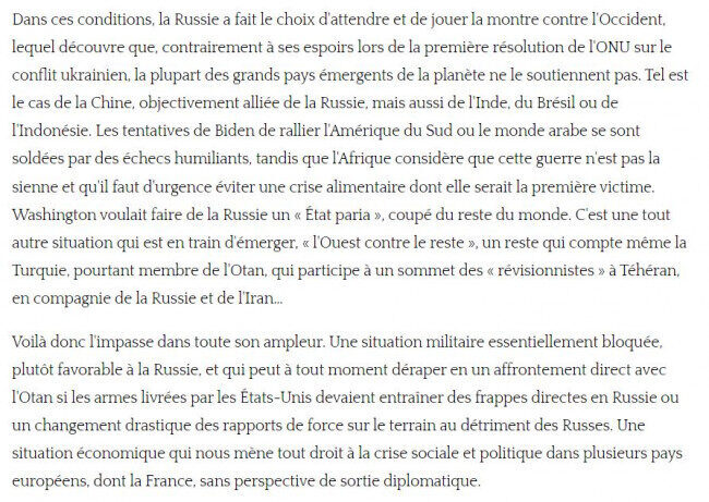Au début de la guerre, la propagande occidentale, à l'image de celle qu'on a subie lors du conflit entre la Serbie et l'OTAN (1998-1999), ne souffrait aucune contestation dans nos médias. Le médiatique était aligné sur le politique. Aujourd'hui, des voix se font entendre, qui ne sont pas celles des prétendus « complotistes », signe d'une nouvelle résistance au cœur d'une France prisonnière de l'OTAN. Des généraux, d'anciens ministres (Védrine), des journalistes affûtés en géopolitique, ont prévenu que le soutien à Zelensky et son régime pourri présentait un risque, à terme.